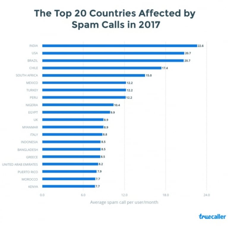 En tête de ce classement se trouve l'Inde avec 22 appels indésirables mensuels par utilisateur, suivie des Etats-Unis avec 20,6 appels spam mensuel par utilisateur à égalité avec le Brésil.