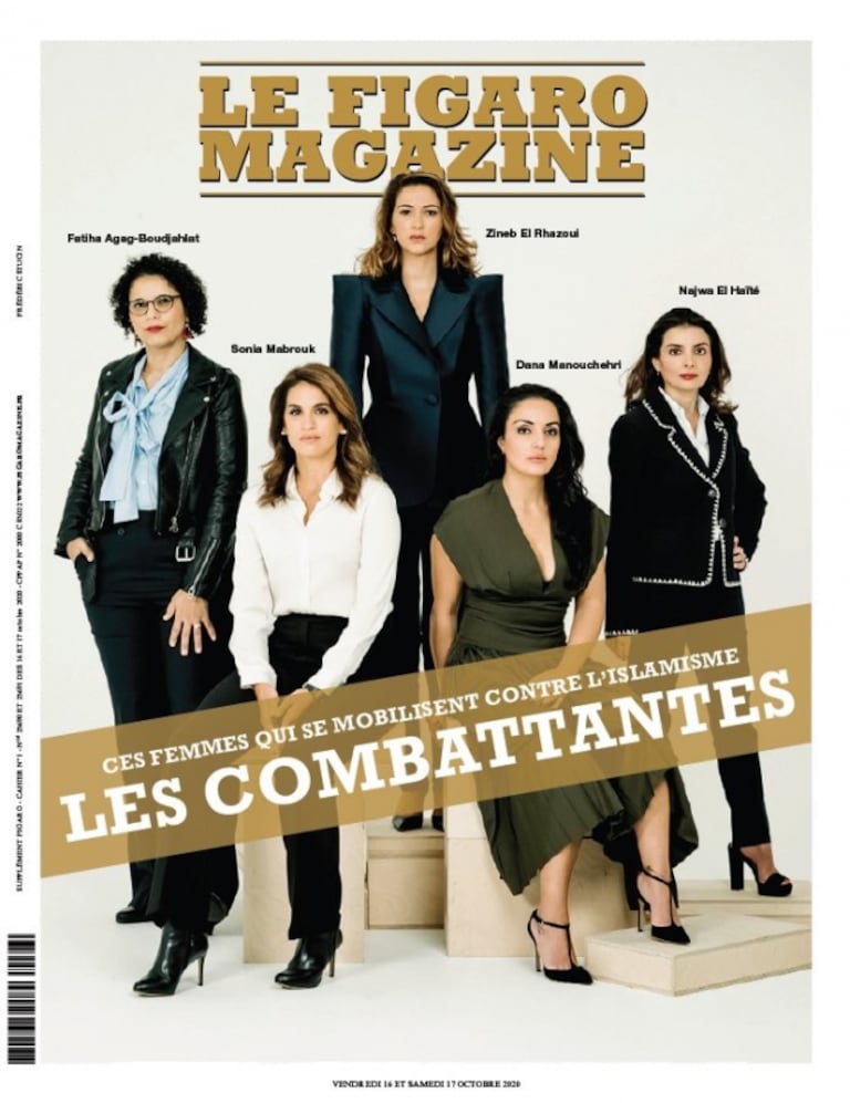 Le profil type des combattantes de l’extrémisme religieuxA l’honneur de cette photo de Une, cinq personnalités féminines plus ou moins bien connues des Français. Au centre, la Franco-Marocaine Zineb El Rhazoui, ancienne journaliste de Charlie Hebdo qui a gagné en notoriété après l’attentat qui a coûté la vie à une partie de la rédaction et que l’on présente dans l’article du Figaro Magazine comme un «symbole de la lutte contre l’islamisme», «la cible des intégristes», «la femme la plus menacée et la plus protégée de France» et enfin la «chef de file du printemps arabe qui a quitté le Maroc en 2011 pour se réfugier en France».