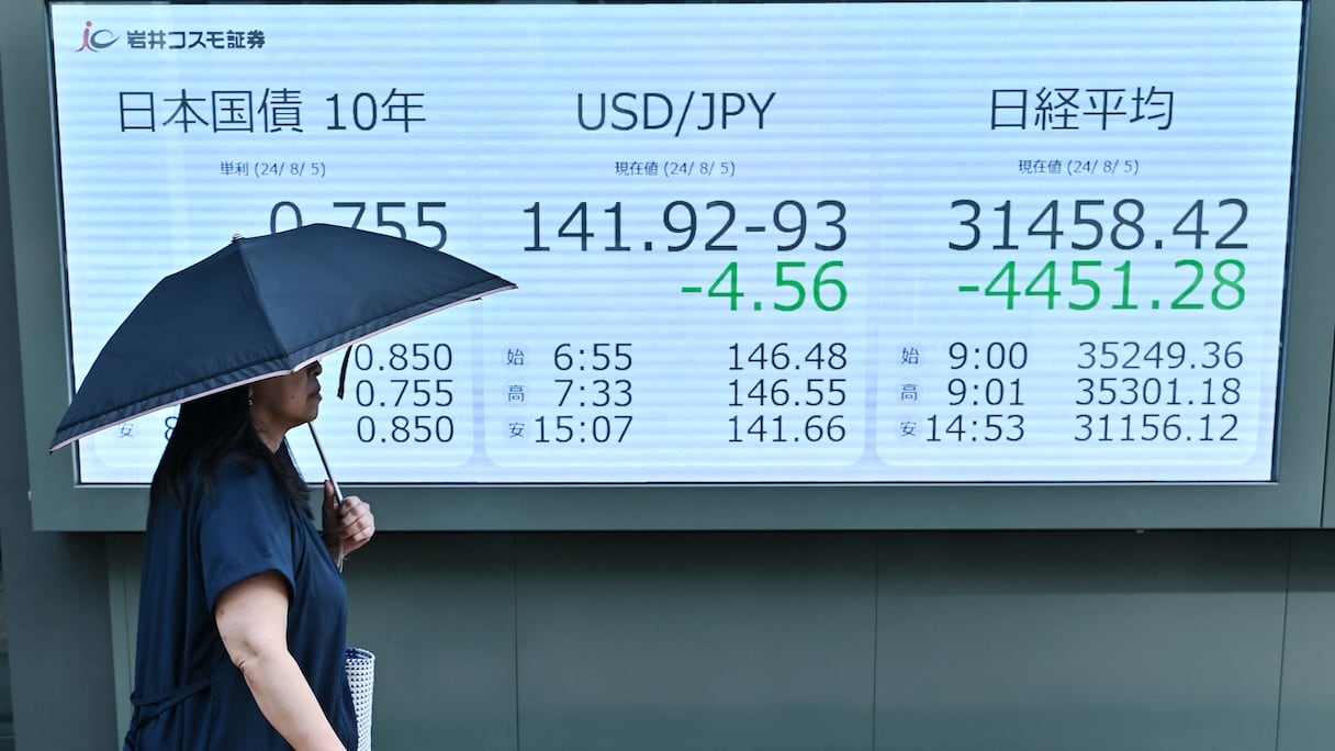 Les Bourses asiatiques étaient en chute libre ce lundi 5 août, Tokyo enregistrant la plus grosse dégringolade en points de son histoire. L’indice vedette Nikkei de la capitale nippone, qui avait déjà dévissé de 5,8% le vendredi précédent, s’est effondré de 12,4% à 31.458,42 points, reculant de quelque 4.400 points sur la séance, au-delà de son précédent record qui remontait au krach boursier d’octobre 1987.