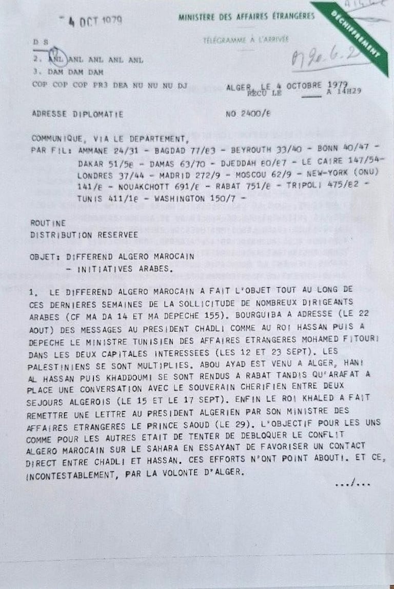 (1) Télégramme émanant de l’ambassadeur de France à Alger, le 4 octobre 1979, intitulé «Différend algéro-marocain, Initiatives arabes. Archives diplomatiques de La Courneuve, Carton 957, Sahara Maroc Algérie, 1979.