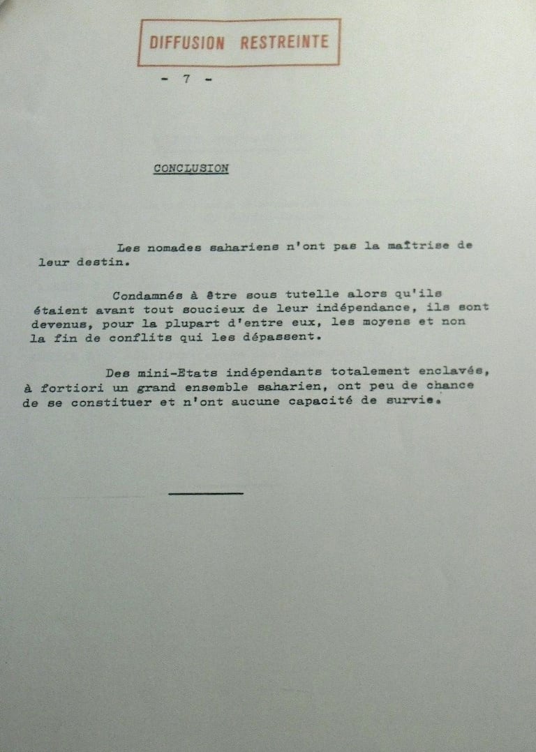 «Les nomades sahariens n’ont pas la maîtrise de leur destin. Condamnés à être sous tutelle alors qu’ils étaient avant tout soucieux de leur indépendance (sociologique), ils sont devenus, pour la plupart d’entre eux, les moyens et non la fin de conflits qui les dépassent. Des mini‑États indépendants totalement enclavés, à fortiori un grand ensemble saharien, ont peu de chance de se constituer et n’ont aucune capacité de survie.» (4)
