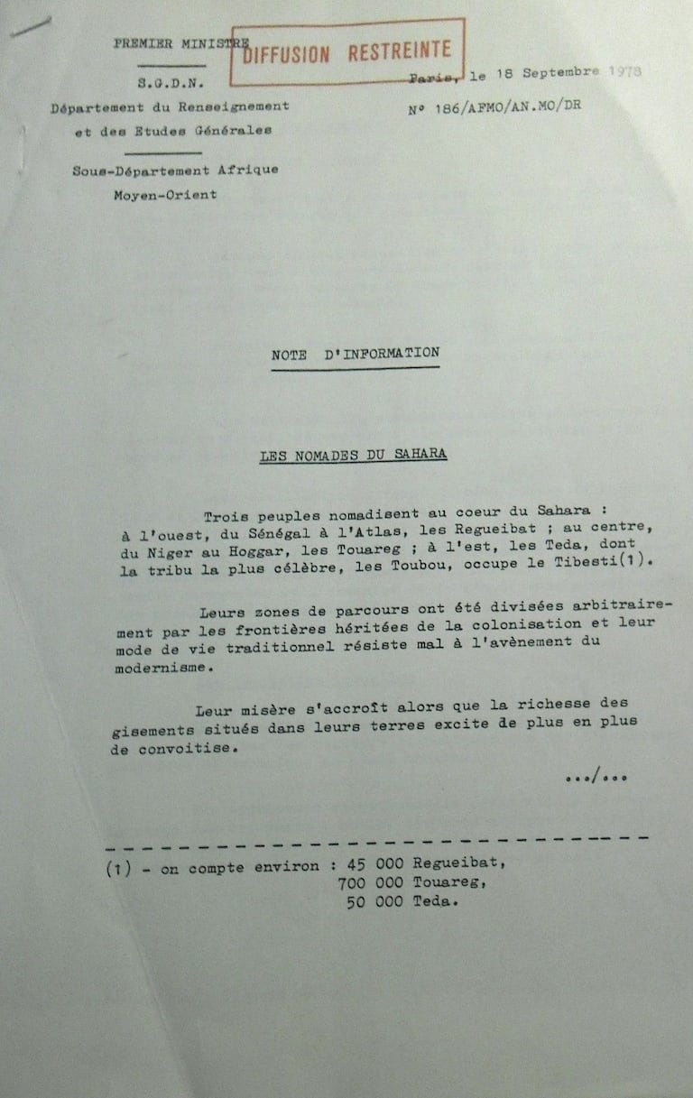 (4) Note d’Information émanant du cabinet du Premier ministre Raymond Barre, intitulée «Les Nomades du Sahara», le 18 septembre 1978. Archives de La Courneuve, ministère des Affaires étrangères, ANMO, Maroc-Sahara Occidental, 1972-1982, Carton 965.