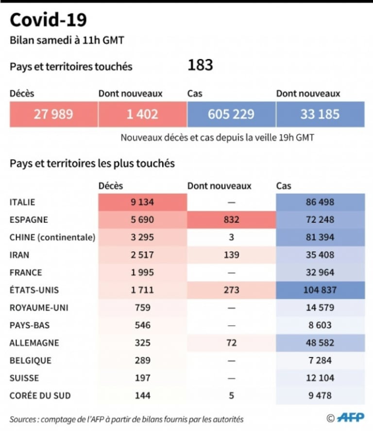 En France, cinquième pays le plus touché en nombre de morts (près de 2.000), le gouvernement a prolongé de deux semaines le confinement, soit jusqu'au 15 avril. "Il va falloir tenir", a prévenu le Premier ministre Edouard Philippe, mettant en garde contre "la vague extrêmement élevée" de la maladie qui "déferle sur la France". L'armée française a évacué samedi par hélicoptère de premiers patients de Metz (est) vers l'Allemagne.