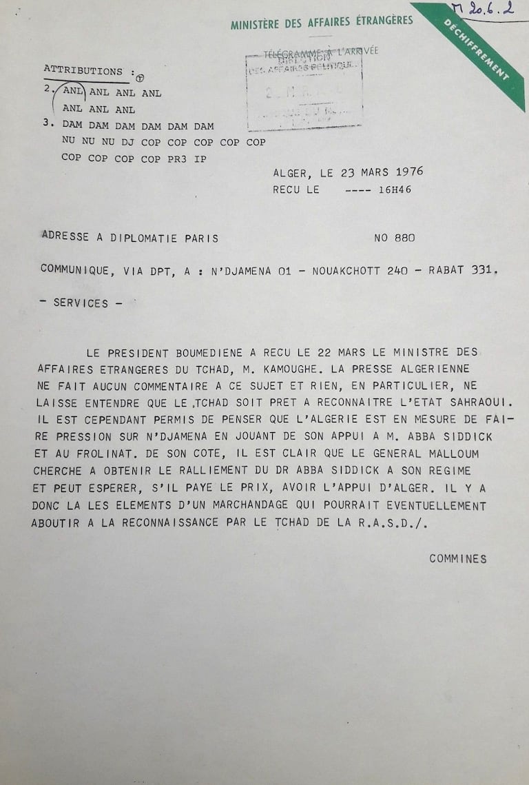 «Le Président Boumediene a reçu le 22 mars (1976) le ministre des Affaires étrangères du Tchad, M. Kamoughe. La presse algérienne ne fait aucun commentaire à ce sujet et rien, en particulier, ne laisse entendre que le Tchad soit prêt à reconnaître l’Etat sahraoui… De son côté, il est clair que le général Malloum cherche à obtenir le ralliement du Dr Abba Siddick à son régime et peut espérer, s’il paye le prix, avoir l’appui d’Alger. Il y a donc là les éléments d’un marchandage qui pourrait éventuellement aboutir à la reconnaissance par le Tchad de la RASD.» (Archives de La Courneuve, ministère des Affaires étrangères, ANMO, Maroc-Sahara Occidental, 1972-1982, Carton 965)