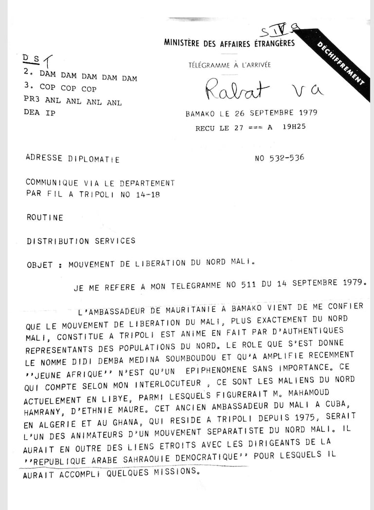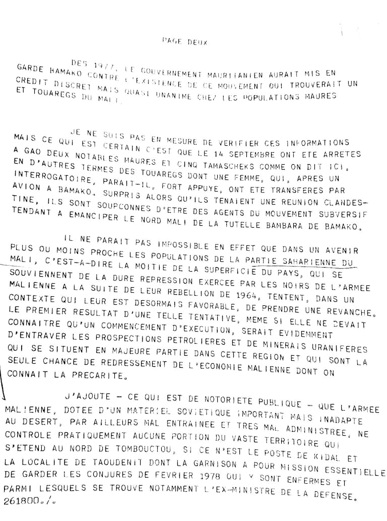«L’Ambassadeur de Mauritanie à Bamako vient de me confier que le mouvement de libération du Mali, plus exactement du Nord Mali, constitué à Tripoli, est animé en fait par d’authentiques représentants des populations du Nord, le rôle que s’est donné le nommé Didi Demba Medina Soumboudou et qu’a amplifié récemment “Jeune Afrique”, n’est qu’un épiphénomène sans importance.»²