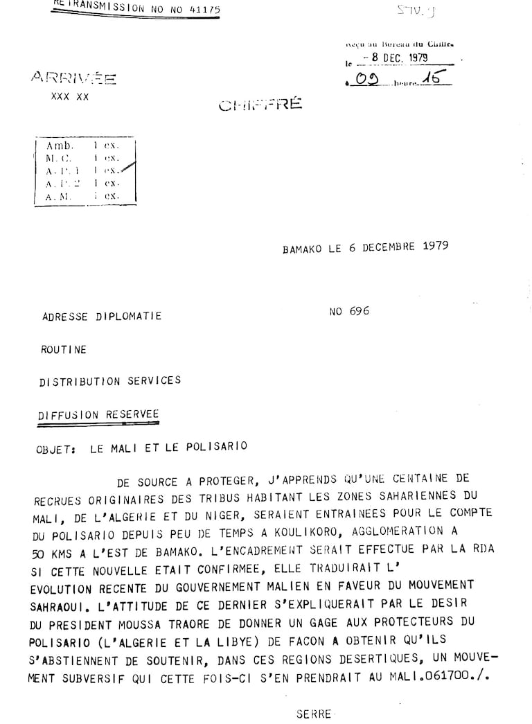 1- Communiqué secret à diffusion restreinte, intitulé «Le Mali et le Polisario», émanant de l’ambassadeur de France à Bamako, Gérard Serre, le 6 décembre 1979. Archives diplomatiques, Centre des archives de Nantes, ambassade de France à Rabat, 558PO/1/221.