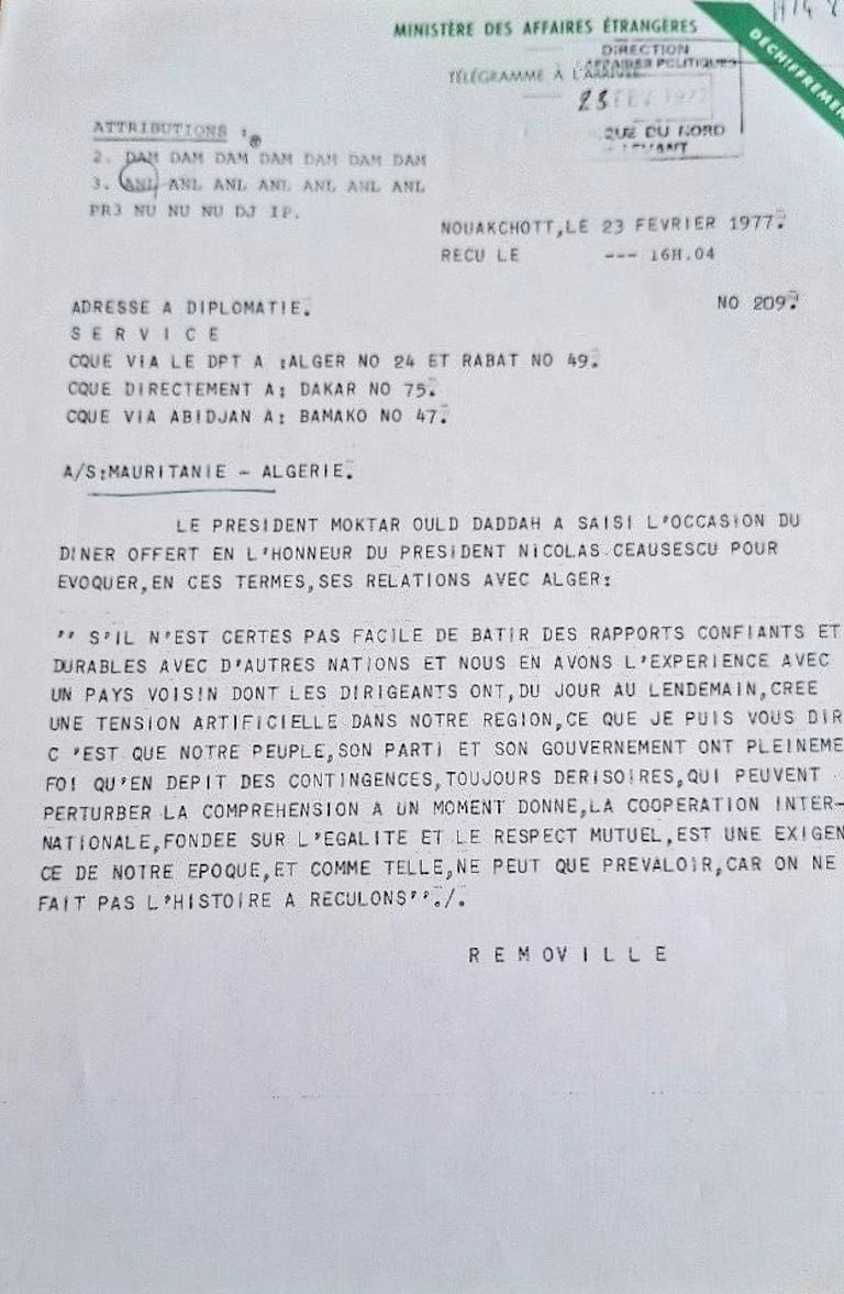 Selon un télégramme diplomatique daté du 23 février 1977, envoyé de Nouakchott par l’ambassadeur de France, Removille, le président Mokhtar Ould Daddah profita d’un dîner offert en l’honneur du président Nicolae Ceausescu pour exposer sa vision des relations entre États, notamment avec l’Algérie. Il déclara alors: