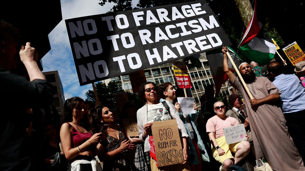 Des rassemblements antiracistes réunissant des centaines de personnes ont été signalés à travers tout le Royaume-Uni: Newcastle et Manchester (nord de l’Angleterre), Cardiff (pays de Galles), Glasgow et Edimbourg (Écosse)... À Londres, près d’un millier de personnes se sont rassemblées devant le siège du parti anti-immigration Reform UK, portant des pancartes «Non au racisme, non à la haine», sans incident.