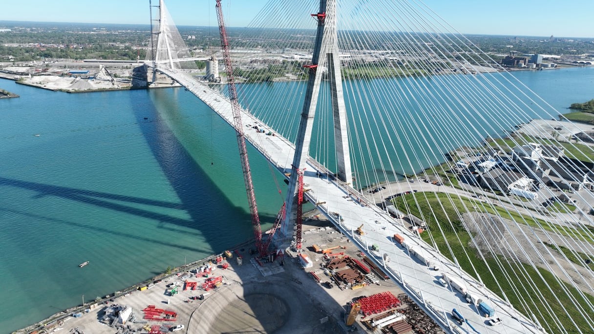 Ce pont encore en construction au-dessus de la rivière Detroit doit relier les villes américaine de Detroit (Michigan) et canadienne de Windsor (Ontario).