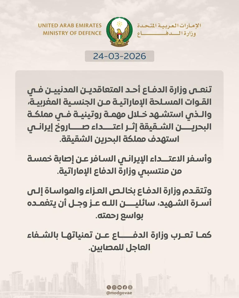 Un employé civil à la retraite, travaillant pour l’armée des Emirats arabes unis a été tué lors d’une attaque de missile iranienne au Bahreïn, a indiqué mardi le ministère de la Défense émiratie. Selon le ministère, il était de nationalité marocaine.