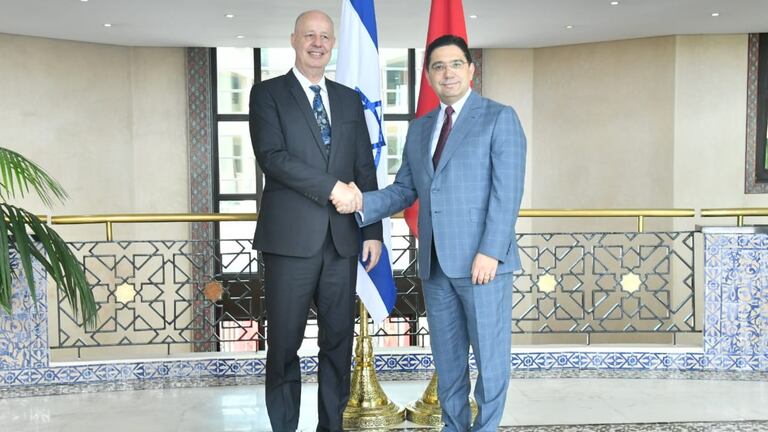 Le ministre des Affaires étrangères, de la Coopération africaine et des Marocains résidant à l’étranger, Nasser Bourita, et le conseiller à la Sécurité nationale d'Israël, Tzachi Hanegbi, le 7 juin 2023 à Rabat.