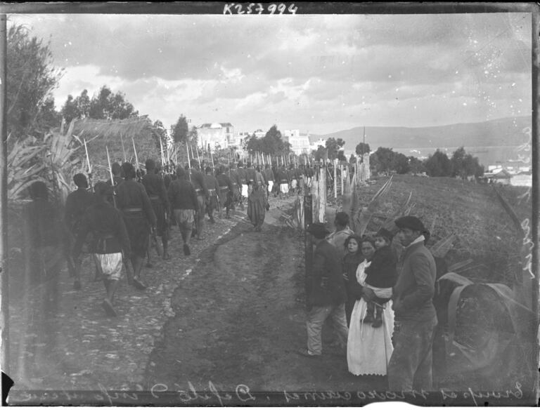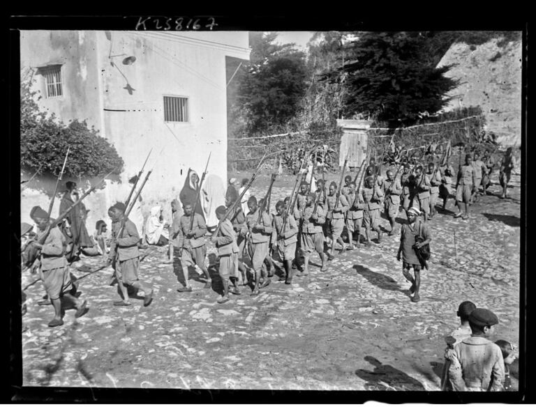 «Troupes marocaines du sultan Abdelaziz, défilé d'infanterie en France», 1908, Jean du Taillis, Agence de presse Rol, BNF.
