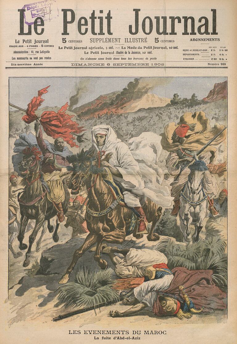 Le sultan du Maroc Moulay Abdelaziz à Marrakech lors de la bataille des Hafidiya, dans Le petit journal Supplément du dimanche 6 septembre 1908.