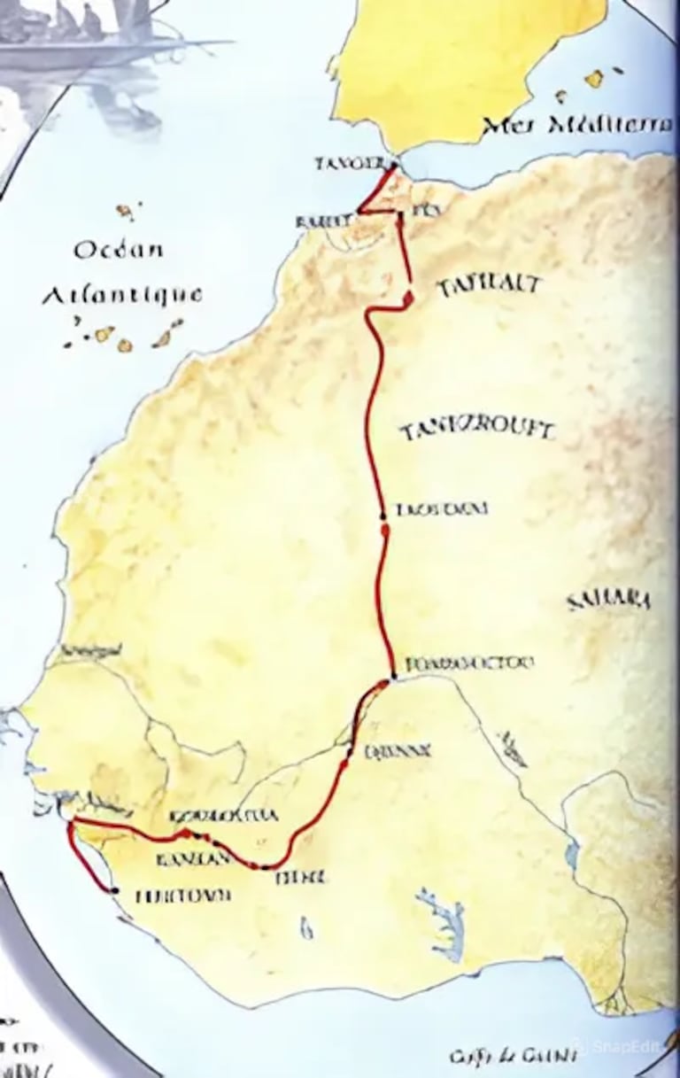 La Route de Caillié" (1827) (René Caillié) à travers l'Empire du Maroc jusqu'à Tombouctou au Mali.