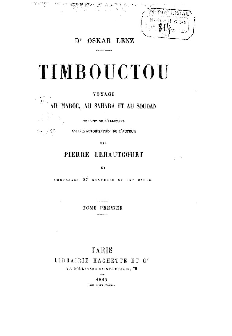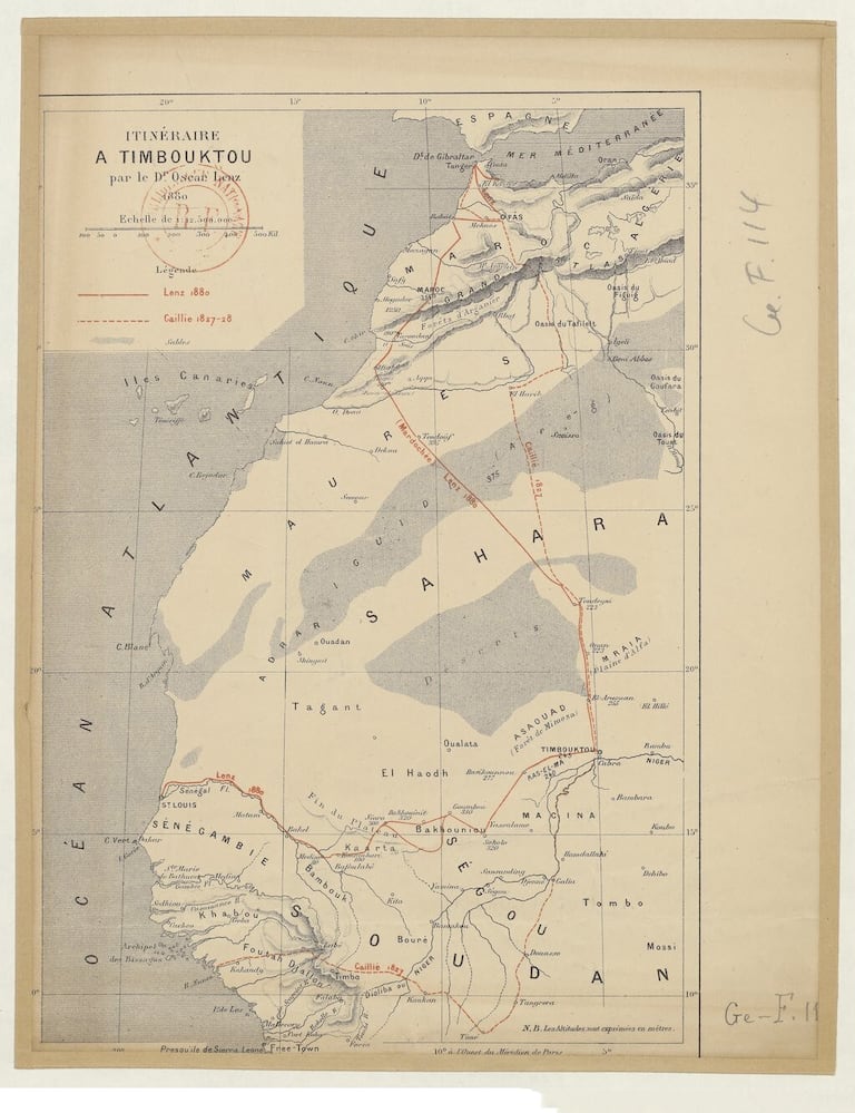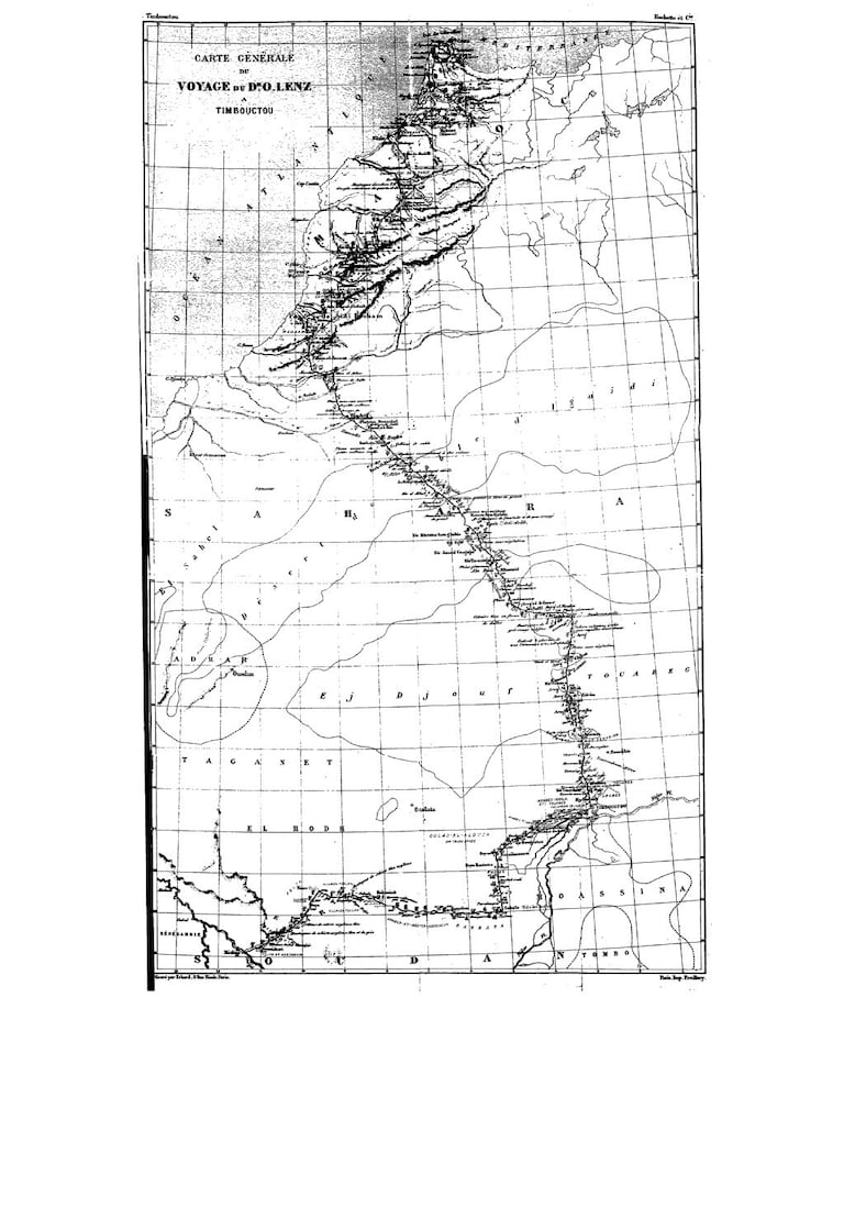«Itinéraire à Timbouktou» par le Oscar Lenz, 1880. La 2ème route figurant sur cette carte est la «Route de Caillié», 1827.