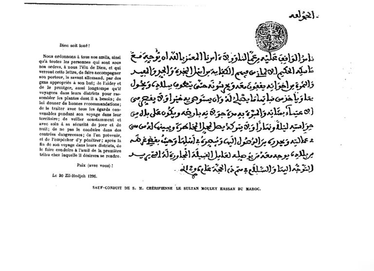 Sauf-conduit chérifien du Sultan Moulay Hassan 1er octroyé à Oskar Lenz durant son voyage au Maroc.