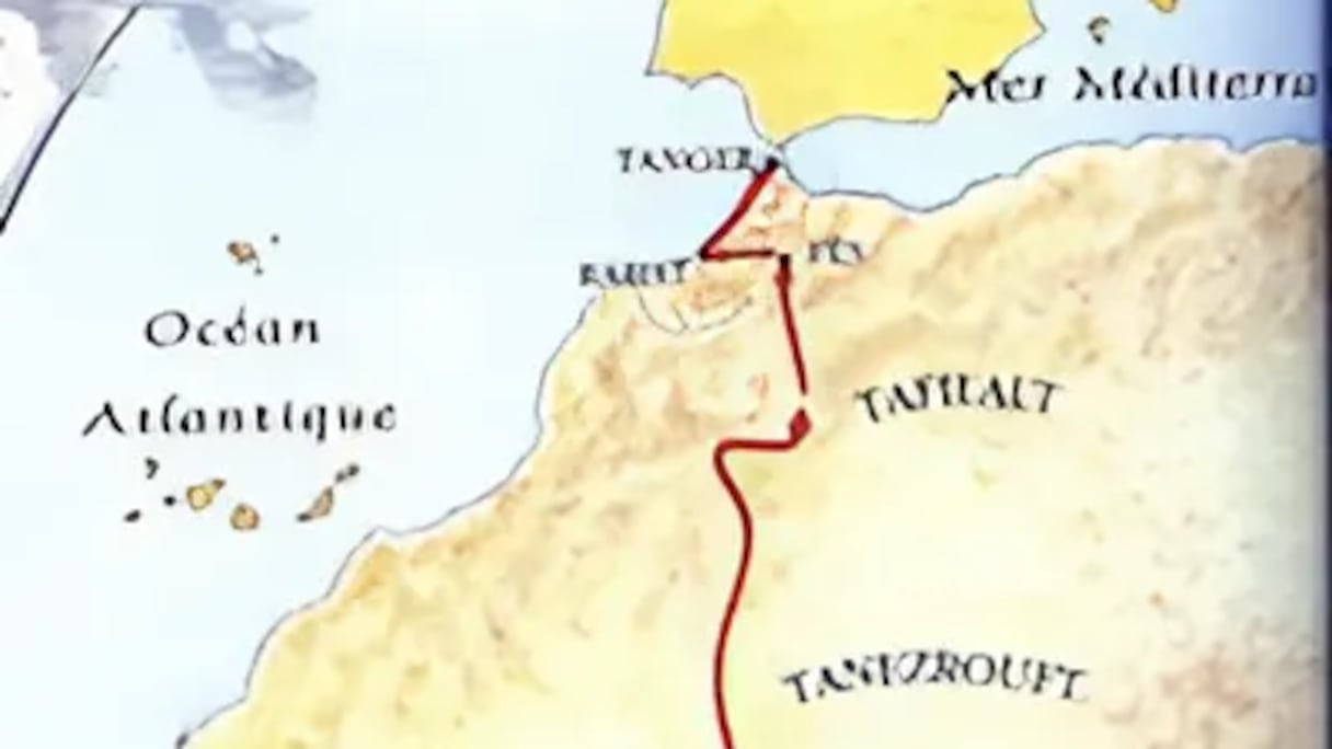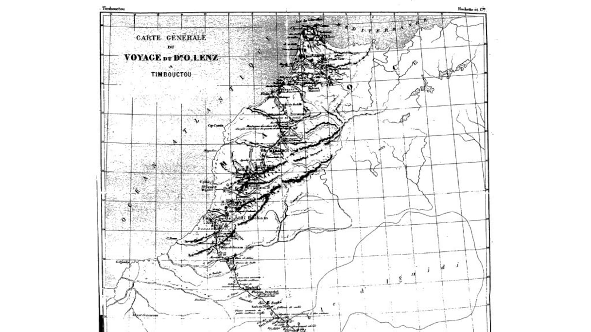 Oskar Lenz va produire une carte géographique, dûment documentée, que nous publions aujourd’hui du territoire marocain qu’il va traverser avec son laissez-passer, de Tanger à Touat à l’est où vivent des chérifs (chourfas marocains) dit l’auteur, et au sud-ouest du Grand Erg (aujourd’hui algérien à cause de son annexion par l’Algérie française) jusqu’à Tombouctou à travers le désert «occidental». Au-delà du Mali, l’influence de l’Empire du Maroc se déploie à l’époque dans l’ancien Soudan et au Sénégal. À cette Route de Lenz (1880), il convient de rajouter la première route connue par les Européens qui traverse le Maroc jusqu’au Mali, la Route de René Caillié (1827) (voir diapos) qui va de Tanger à Touat et descend en ligne droite jusqu’à Tombouctou, avant de bifurquer à l’Ouest jusqu’à l’actuelle Guinée.