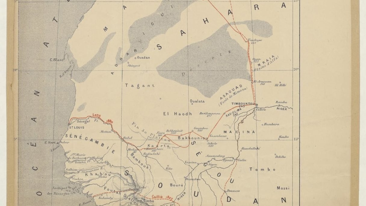«Itinéraire à Timbouktou» par le Oscar Lenz, 1880. La 2ème route figurant sur cette carte est la «Route de Caillié», 1827.