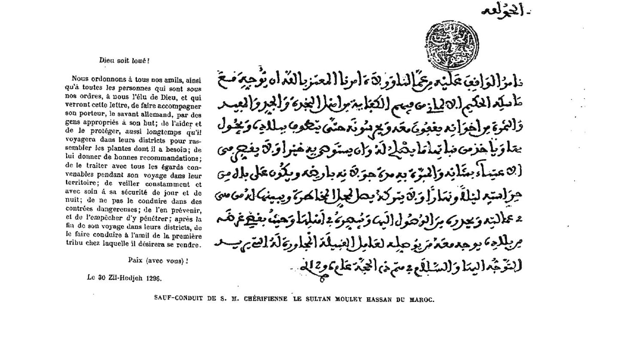 «Pendant l’automne 1879, je reçus de la Société Africaine d’Allemagne la mission d’entreprendre un voyage au Maroc, de façon à contribuer, autant que possible, à la connaissance approfondie de la chaine de l’Atlas» (p.9, préface). Ainsi commence le récit de deux ans de voyage du docteur austro-hongrois Oskar Lenz («Timbouctou: voyage au Maroc, au Sahara et au Soudan», 2 tomes, 1886-1887, Bibliothèque Joseph-Simon Galliéni) qui le fera sillonner tout le territoire marocain jusqu’à Tindouf et Touat, puis sans jamais quitter l’Empire jusqu’en Afrique occidentale. Il part muni d’un sauf-conduit chérifien du Sultan Moulay Hassan 1er (Voir galerie photos): «Nous ordonnons à tous nos amils (gouverneurs, NDLR), ainsi qu’à toutes les personnes qui sont sous nos ordres, à nous l’élu de Dieu, et qui verront cette lettre, de faire accompagner son porteur, le savant allemand, par des gens appropriés à son but; de l’aider et de le protéger, aussi longtemps qu’il voyagera dans leurs districts pour rassembler les plantes dont il a besoin (…) de le traiter avec tous les égards convenables pendant son voyage dans leur territoire.» (p.8).