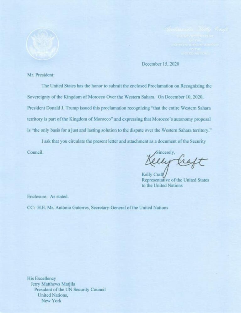 Une copie de la Proclamation du Président Donald Trump sur le Sahara marocain a été jointe à la lettre que Mme Craft a envoyée au Conseil de sécurité et au Secrétaire général de l’ONU. La Proclamation réaffirme ainsi le soutien des Etats-Unis à "la proposition d'autonomie sérieuse, crédible et réaliste du Maroc comme seule base pour une solution juste et durable au différend sur le territoire du Sahara Occidental".