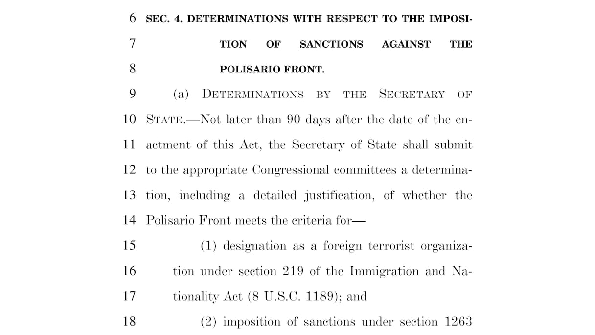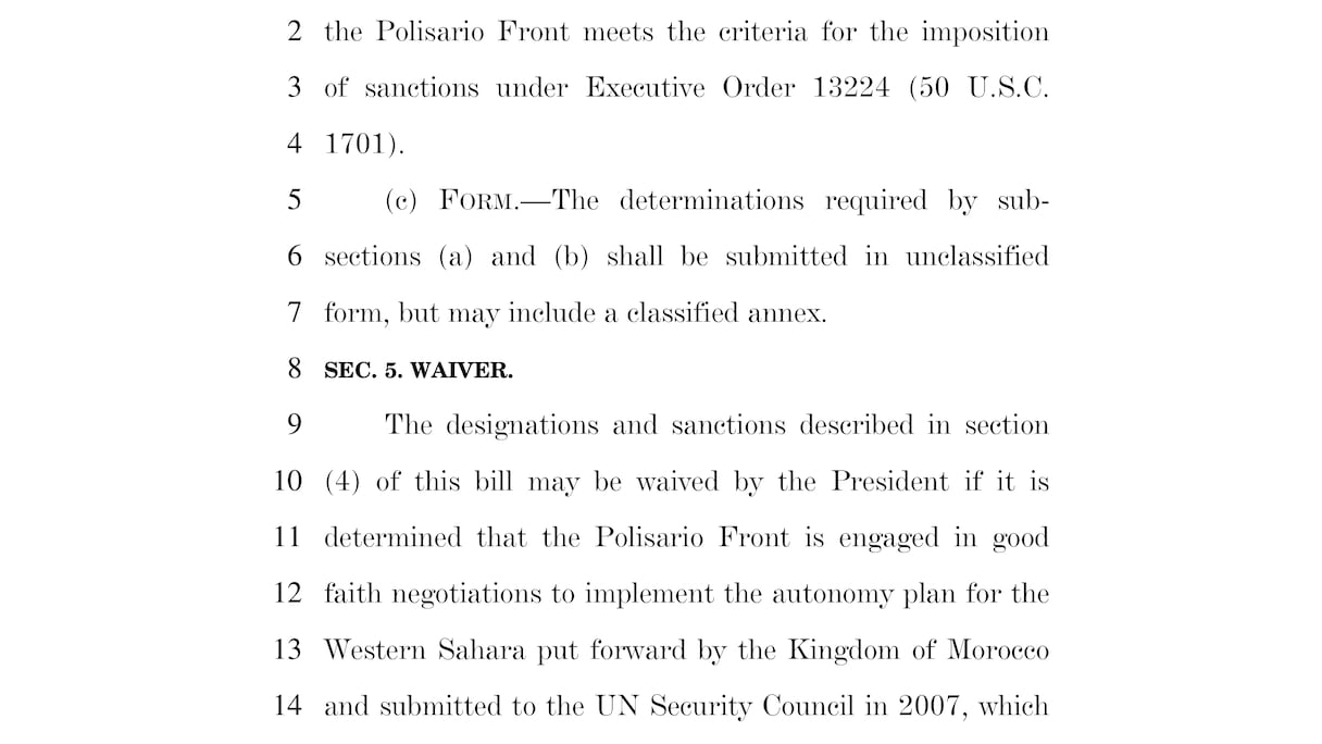 «Les désignations et sanctions décrites à la section 4 du présent projet de loi peuvent faire l’objet d’une dérogation par le Président s’il est déterminé que le Front Polisario est engagé, de bonne foi, dans des négociations visant à mettre en œuvre le plan d’autonomie pour le Sahara occidental présenté par le Royaume du Maroc et soumis au Conseil de sécurité des Nations unies en 2007, lequel propose d’accorder au peuple sahraoui un degré élevé d’autogouvernance dans le cadre de la souveraineté marocaine.»