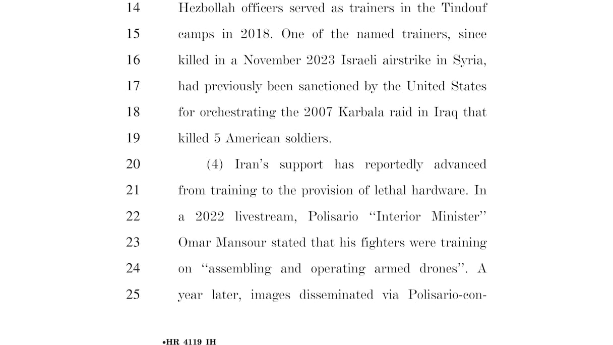 Le Polisario Front Terrorist Designation Act évoque aussi «trois officiers du Hezbollah [qui] ont servi comme formateurs dans les camps de Tindouf en 2018. L’un des formateurs nommément identifiés, tué depuis lors dans une frappe israélienne en Syrie en novembre 2023, avait auparavant été sanctionné par les États-Unis pour avoir orchestré le raid de Karbala de 2007, en Irak, qui avait tué cinq soldats américains».