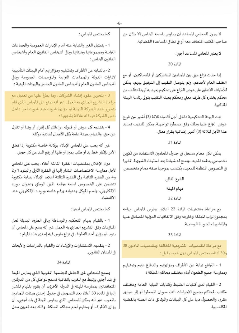La formule «كما يختص المحامي» suscite particulièrement l’inquiétude. Interprétée de manière extensive, elle pourrait instaurer une exclusivité de fait, au détriment d’autres professions pourtant légalement habilitées.