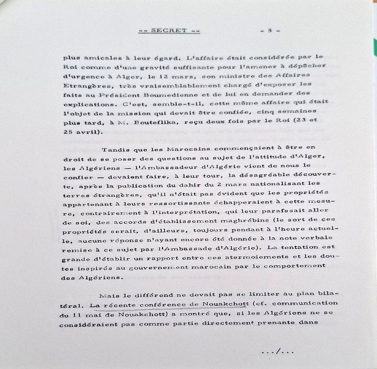 «L’affaire était considérée par le Roi comme d’une gravité suffisante pour l’amener à dépêcher d’urgence à Alger, le 12 mars, son ministre des Affaires étrangères, très vraisemblablement chargé d’exposer les faits au président Boumediene et de lui en demander des explications.»