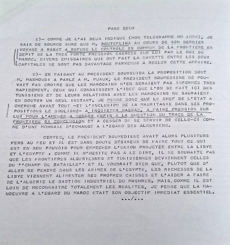 «Mais, comme il (Boumediene) est loin de méconnaitre totalement les réalités, je pense que la manœuvre à l’égard du Maroc était son objectif immédiat essentiel. D’ailleurs, quelques jours après les entretiens du Kef (Entre Boumediene et Bourguiba, en mai 1973), il ratifiait spectaculairement, le 17 mai 1973, les accords de juin 1972 sur le tracé de la frontière algéro-marocaine et sur l’exploitation de la mine du Gara Djebilet (mon télégramme N° 1276). Il mettait ainsi le Maroc au pied du mur au moment même où l’OUA, témoin des engagements pris à Rabat, allait se réunir à Addis-Abeba».