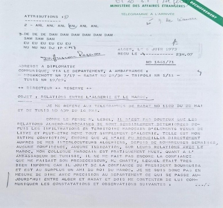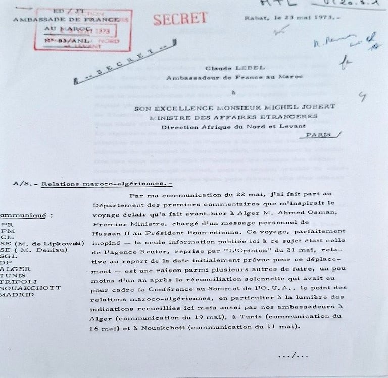 Deux dépêches diplomatiques françaises éclairent cette rupture. La première, un communiqué secret de Claude Lebel, ambassadeur de France à Rabat, adressé à Michel Jobert le 22 mai 1973. La seconde, un télégramme circulaire envoyé depuis Alger par l’ambassadeur Jean-Marie Souto, le 6 juin 1973. Leur diagnostic converge: en huit mois à peine après la signature du traité, les relations entre Rabat et Alger se sont dégradées à vive allure; surtout, ces documents exclusifs pointent, sans équivoque, les commanditaires des événements de Moulay Bouazza, la Libye avec la complicité de l’Algérie.