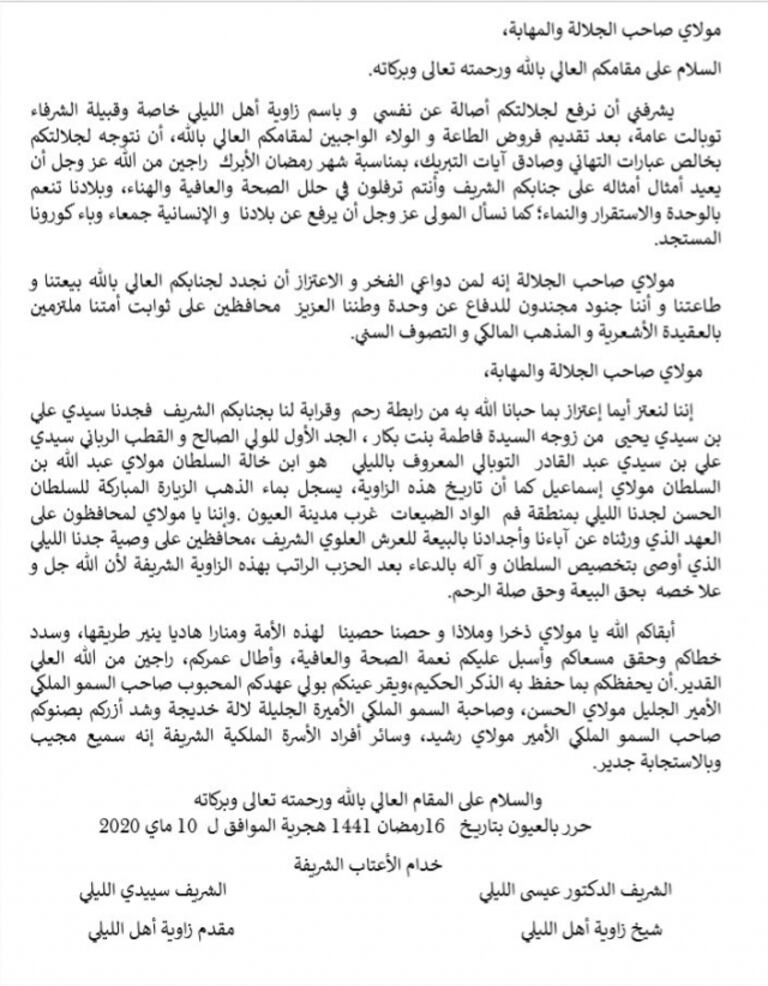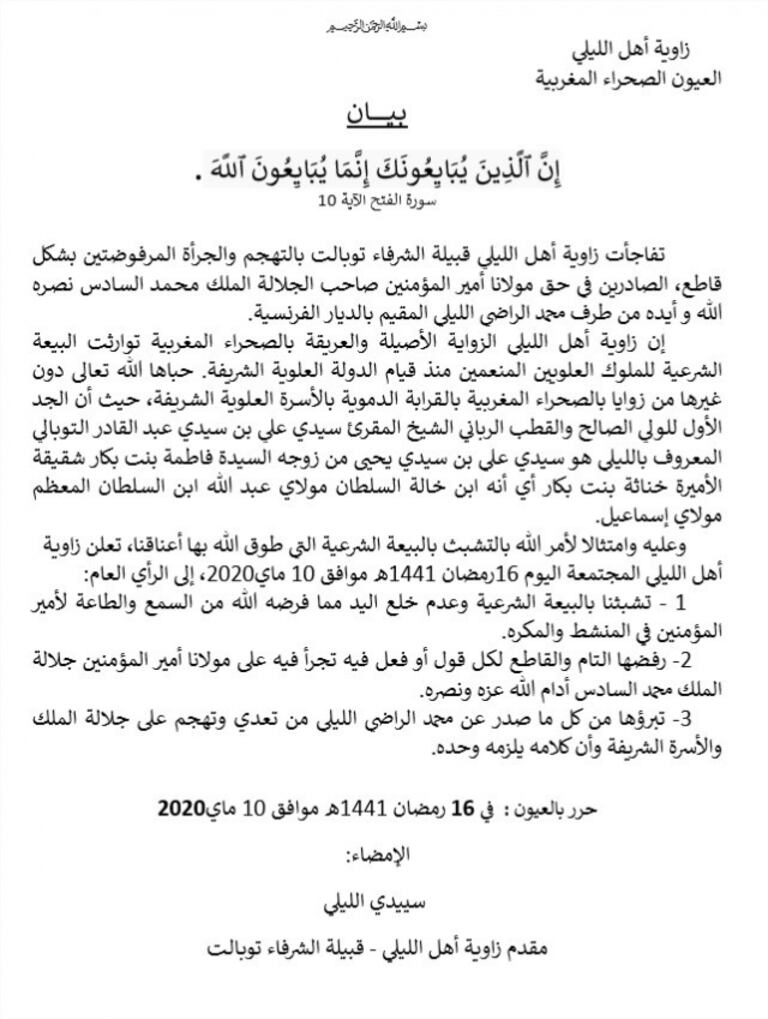 La zaouia de Sidi Ellili ainsi que la tribu sahraouie Toubalt ont adressé le 10 mai 2020 une lettre au roi Mohammed VI pour lui renouveler leur allégeance au trône alaouite, tout en lui rappelant les liens ancestraux qu’entretient cette tribu avec les aïeuls du chef de l’Etat. Cette lettre a été accompagnée par un communiqué de la zaouia Ellili et de la tribu des Toubalt dans lequel elles condamnent avec vigueur les «attaques et l’insolence» d’un dénommé Mohamed Radi Ellili qui utilise son appartenance à cette tribu comme un faire-valoir et laisse croire qu’il bénéficie de l’approbation des siens.