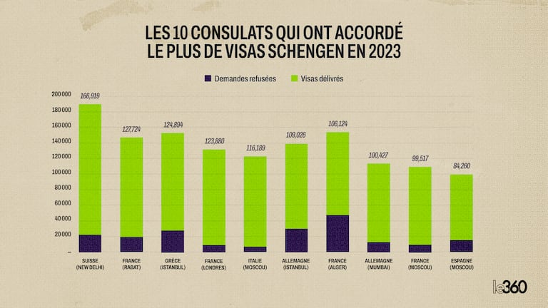 Les 10 consulats qui ont accordé le plus de visas Schengen en 2023 (Source : ministère des Migrations et des Affaires intérieures de l’UE).