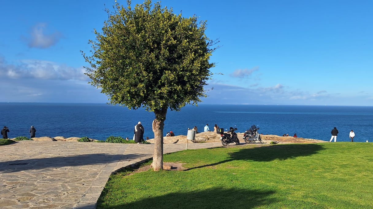 En avançant vers le bord du plateau, juste avant que le terrain ne bascule dans le ravin planté d’arbres et de végétation sauvage, la vue s’ouvre soudain, immense, comme un rideau que l’on soulève d’un seul geste. Devant moi, la mer déploie une palette de bleus que seule Tanger sait offrir: cobalt, turquoise, bleu profond, bleu argenté. À gauche, l’Atlantique, vaste et sombre. À droite, la Méditerranée, plus calme, plus lumineuse. Et face à moi, l’Europe, si proche qu’on croit pouvoir la toucher du regard. Ici, en un seul coup d’œil, l’histoire et la géographie se rejoignent: le Nord et le Sud se font face, l’Orient et l’Occident se tendent la main. Depuis des millénaires, navigateurs phéniciens, marchands romains, voyageurs arabes et explorateurs portugais ont traversé ce détroit, laissant derrière eux des traces que le sol de Tanger porte encore en silence. Non loin de là, le Café Hafa, accroché lui aussi à la falaise, rappelle cette longue tradition de contemplation et de passage.