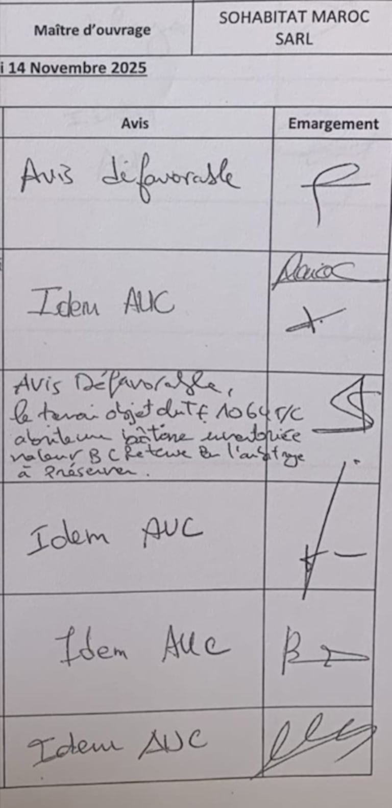 Cette demande est rejetée par l’Agence urbaine, précisément en raison de la valeur patrimoniale du bâtiment. Une commission mixte est alors dépêchée sur place. Le 14 novembre 2025, elle rend un avis défavorable, à l’unanimité de ses membres. Autrement dit, la démolition demandée par SOHABITAT MAROC n’est pas autorisée. Dans le document ci-dessous, les noms des membres de la commission mixte ont été enlevés à la demande de notre source: