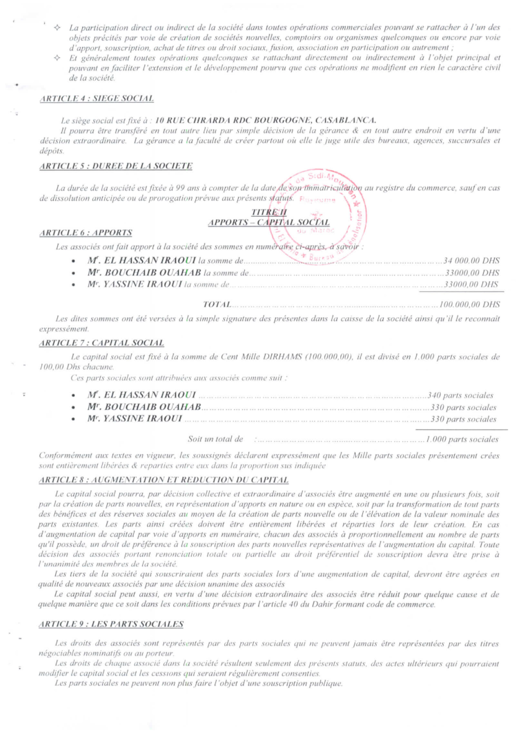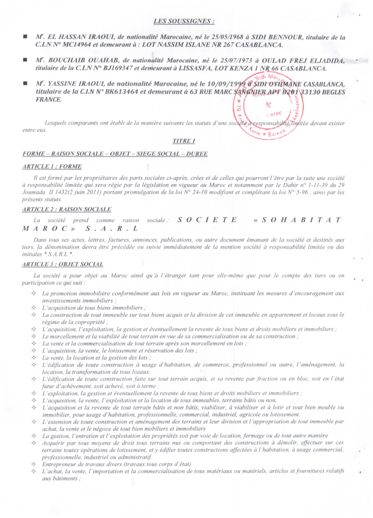 Selon les documents, l’actionnaire majoritaire de SOHABITAT MAROC est Hassan Iraoui, président d’arrondissement de la commune rurale de Jabria, dans la province de Sidi Bennour, entre El Jadida et Safi. Deux autres noms apparaissent dans les statuts de la société: Yassine Iraoui, présenté comme membre de sa famille et domicilié à Bègles, en France, ainsi que Bouchaib Ouahab.
