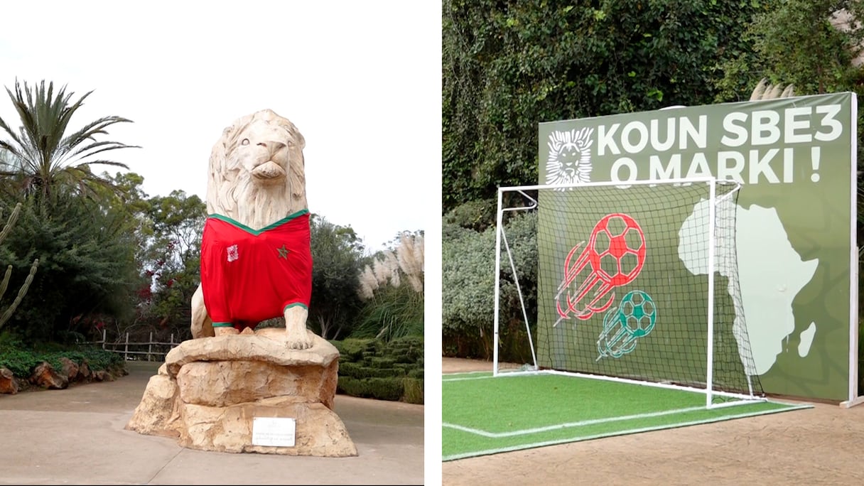 Une sculpture d’un lion revêtu du maillot de la sélection nationale de foot, une cage avec filets et ballon... dès l’entrée du parc zoologique de Rabat, le ton est donné, celui de la CAN 2025 que le Maroc organise du 21 décembre 2025 au 18 janvier 2026.