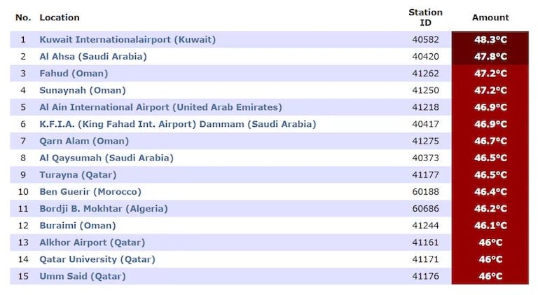 En tête du top mondial: Koweït City (48,3°C), suivie de la ville saoudienne Al-Ahsa (47,8°C) et Al-Fahoud au Sultanat d’Oman (47,2°C).