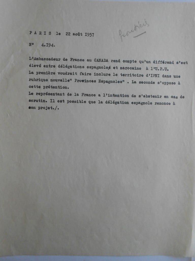 Le document ci-dessous, traitant de la réunion de l’Union Postale Universelle tenue au Canada en 1957, témoigne des efforts persistants de la diplomatie marocaine de contrer les ambitions espagnoles. La délégation marocaine a rejeté la tentative espagnole de présenter Ifni comme un territoire de souveraineté espagnole: