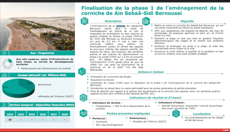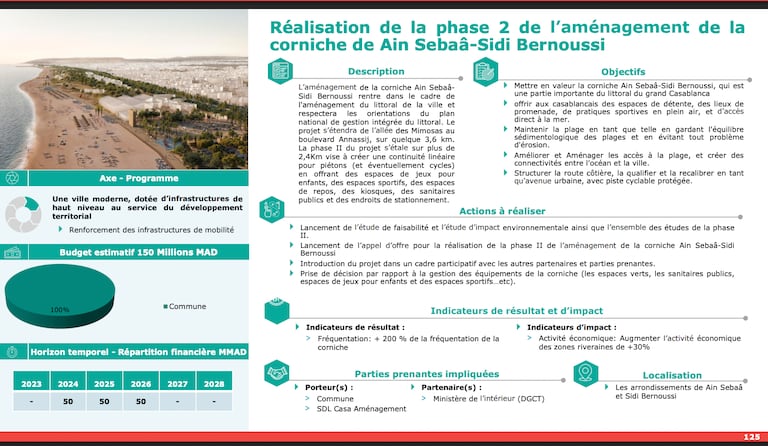 «La première phase du projet prévoit une promenade aménagée avec l’équipement minimum requis pour les estivants qui fréquentent les plages de Aïn Sebaâ et Sidi Bernoussi (sanitaires, kiosques, aires de jeux pour enfants, agrès de sport, etc.)», ajoute la même source.