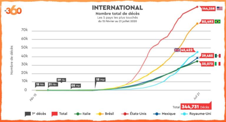 L'épidémie, qui a fait selon le dernier décompte de l'AFP au moins 610.604 morts et contaminé plus de 14.736.130 personnes, continue de progresser.