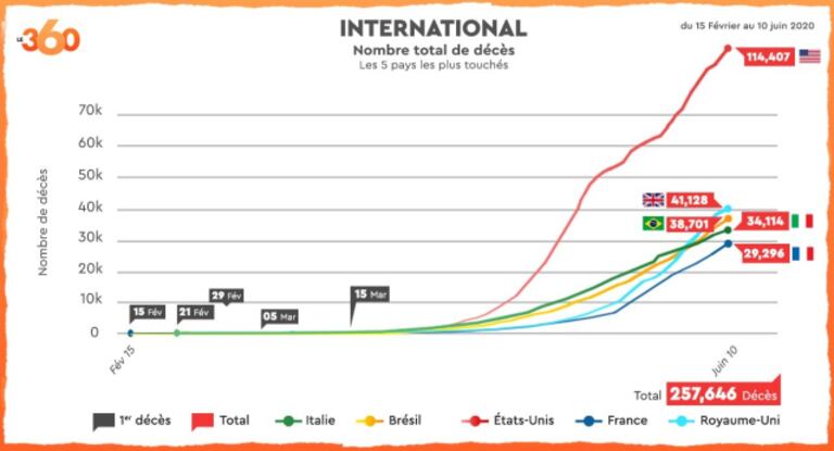 Après les États-Unis, les pays les plus touchés sont le Royaume-Uni avec 40.883 morts pour 289.140 cas, le Brésil avec 38.406 morts (739.503 cas), l'Italie avec 34.043 morts (235.561 cas), et la France avec 29.296 morts (154.591 cas).