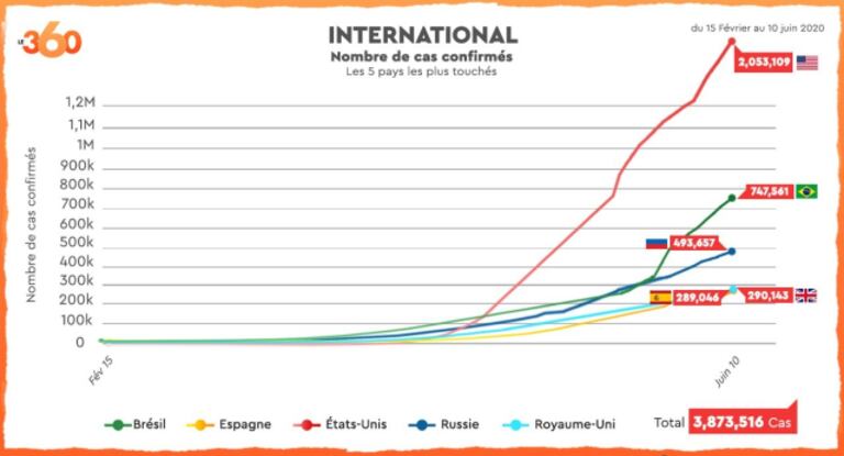 La pandémie du nouveau coronavirus a touché 7.254.143 (+120.531 en 24 heures) de personnes et fait au moins 411.588 (+5.031 en 24 heures) morts et dans le monde depuis son apparition en décembre en Chine, selon le comptage de l’AFP mercredi 10 juin à 12h00 GMT.