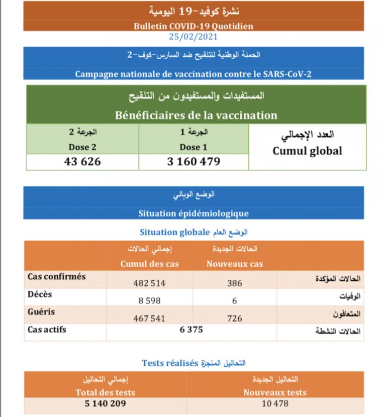 En Tunisie, 662 nouveaux cas de contamination, 26 décès et 2.127 guérisons ont été enregistrés sur les dernières 24 heures. Le pays totalise près de 230.443 cas de contamination, dont 7.869 décès et plus de 192.282 guérisons depuis mars 2020.