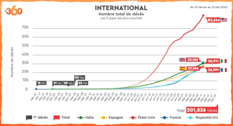 Si l'épidémie est en recul à New York, de nouveaux foyers sont apparus ailleurs, comme dans la région de la capitale Washington, où un hôpital de campagne a été installé lundi. Le pays devrait dépasser les 100.000 morts d'ici le mois de juin d'après les modèles épidémiologiques réalisés par des chercheurs de l’université du Massachusetts.