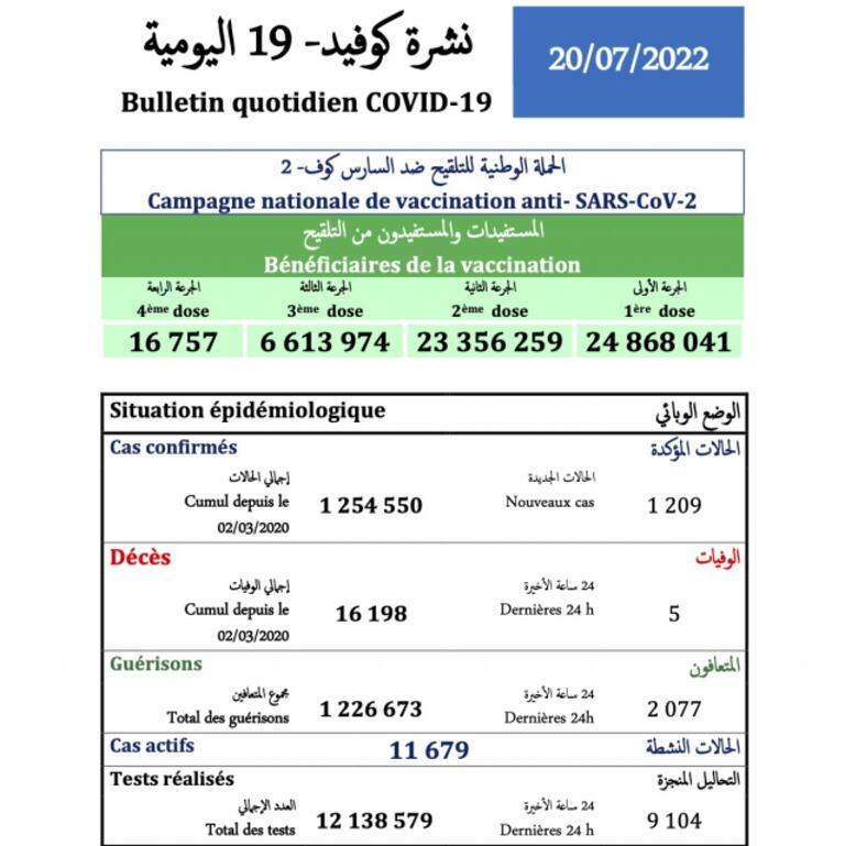 © Copyright : ministère de la SantéAu Maghreb, l'Algérie ne communique pas le nombre de tests de dépistage, ce qui laisse penser que le nombre de contaminations est bien supérieur aux chiffres officiels. Le dernier bilan arrêté fait état de 55 cas de contamination, 25 guérisons et aucun décès. Le pays totalise 266.542 cas de contamination, dont 6.875 décès et 178.829 guérisons.