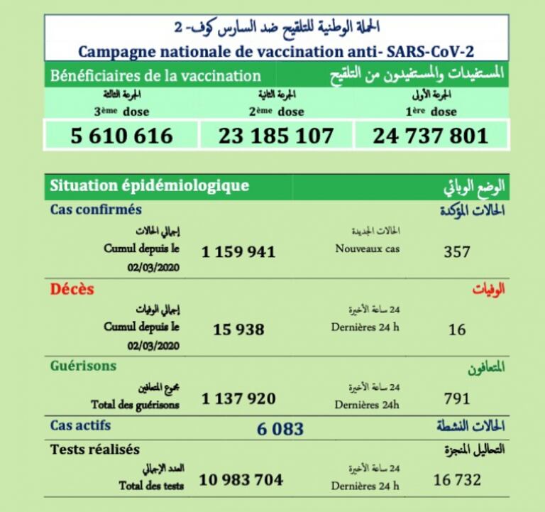 Nouveaux cas de contamination, rémissions, nombre de dépistages effectués, vaccinations, etc. Pour en savoir plus sur l'évolution du coronavirus au Maroc, cliquez sur ce lien: https://covid.le360.ma.