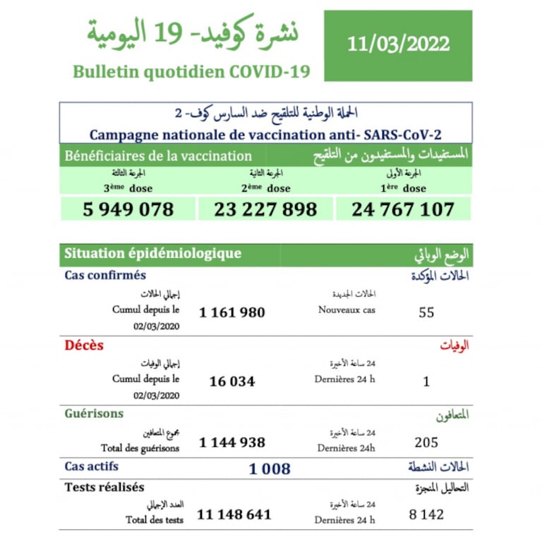 © Copyright : Ministère de la SantéAu Maghreb, l'Algérie ne communique pas le nombre de tests de dépistage, ce qui laisse penser que le nombre de contaminations est bien supérieur aux chiffres officiels. Le dernier bilan arrêté fait état de 20 nouveaux cas infectés par le Covid-19, 1 décès et 22 guérisons. Le pays totalise 265.366 cas de contamination, dont 6.861 décès et 177.977 guérisons.
