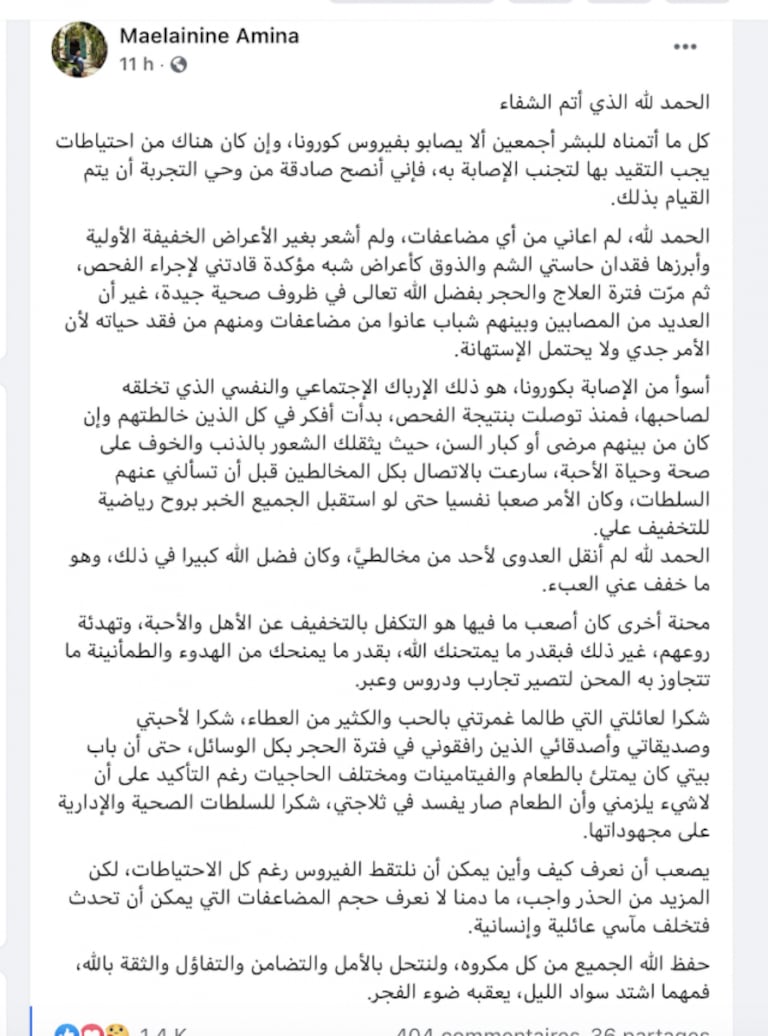 Dans cette publication, Amina Maelainine remercie les autorités sanitaires et locales de l’avoir aidée à passer ce cap. Elle a, de même, rendu hommage à sa famille et à ses amis pour leur soutien.