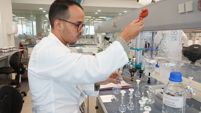 Un professionnel dans le laboratoire de recherche de Pharma 5, réalisant des analyses sur un échantillon de CBD. (K.Essalak/Le360)