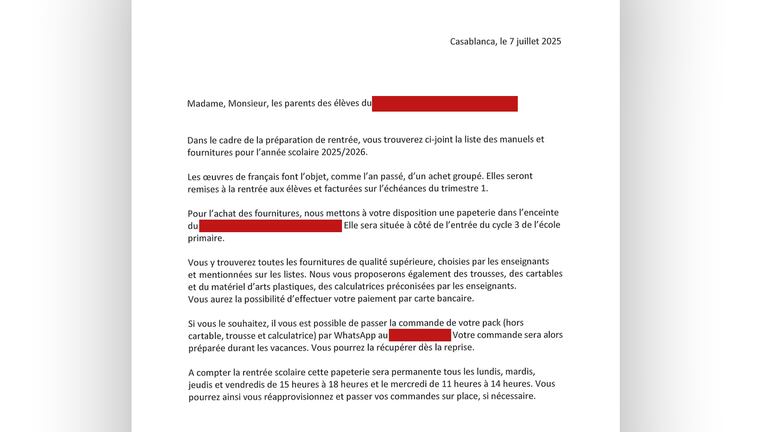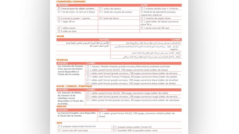 La liste de fournitures scolaires d'une école privée qui omet volontairement le nom des manuels pour imposer aux familles de les acheter auprès de l'école à la rentrée